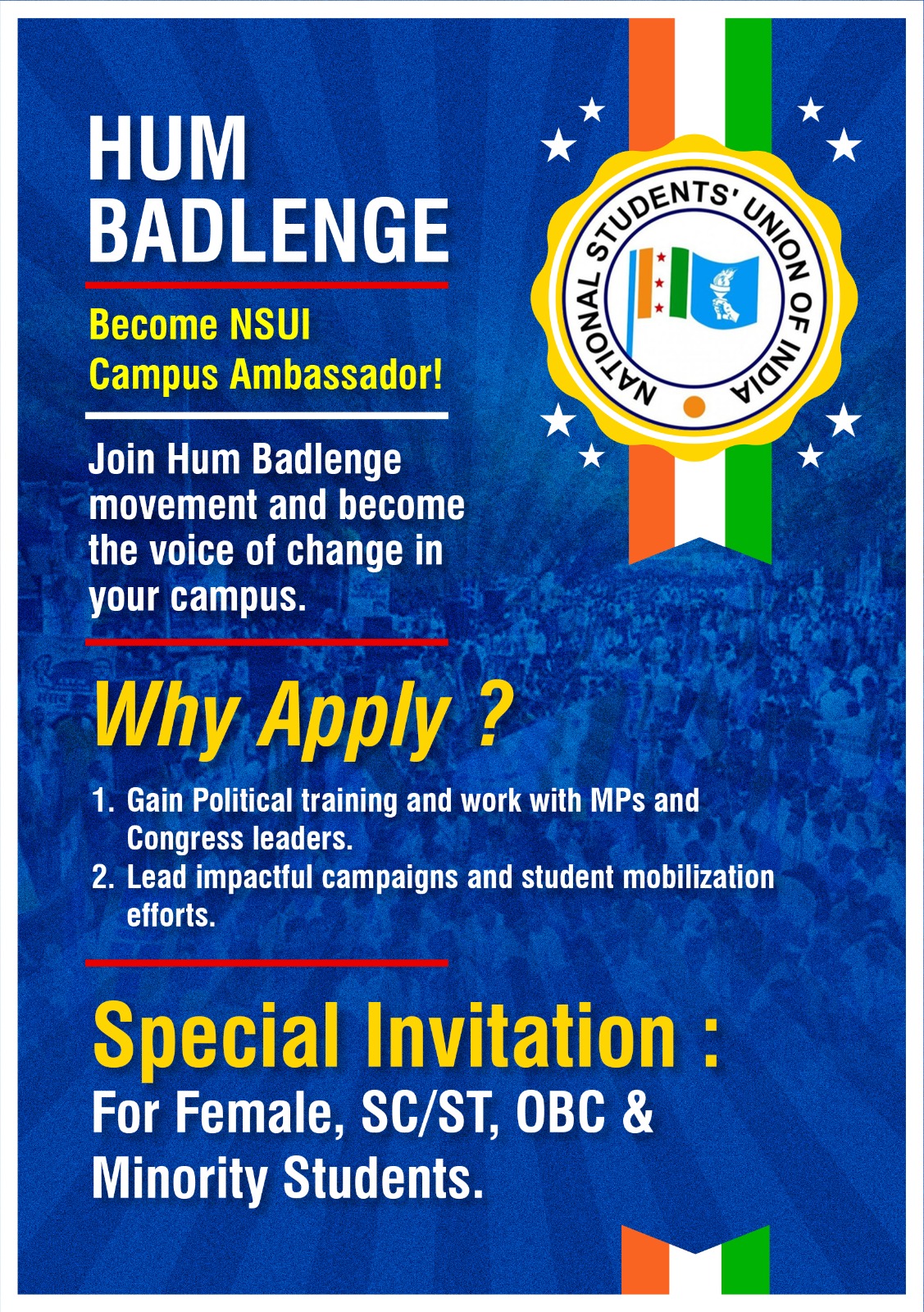 The "Hum Badlenge" campaign seeks to redefine student politics by promoting a socially responsible, inclusive, and progressive approach to leadership. By focusing on diversity, political training, and active engagement, NSUI aims to create a cadre of leaders who embody the ideals of justice, equality, and secularism, making Indian campuses vibrant hubs of social change.